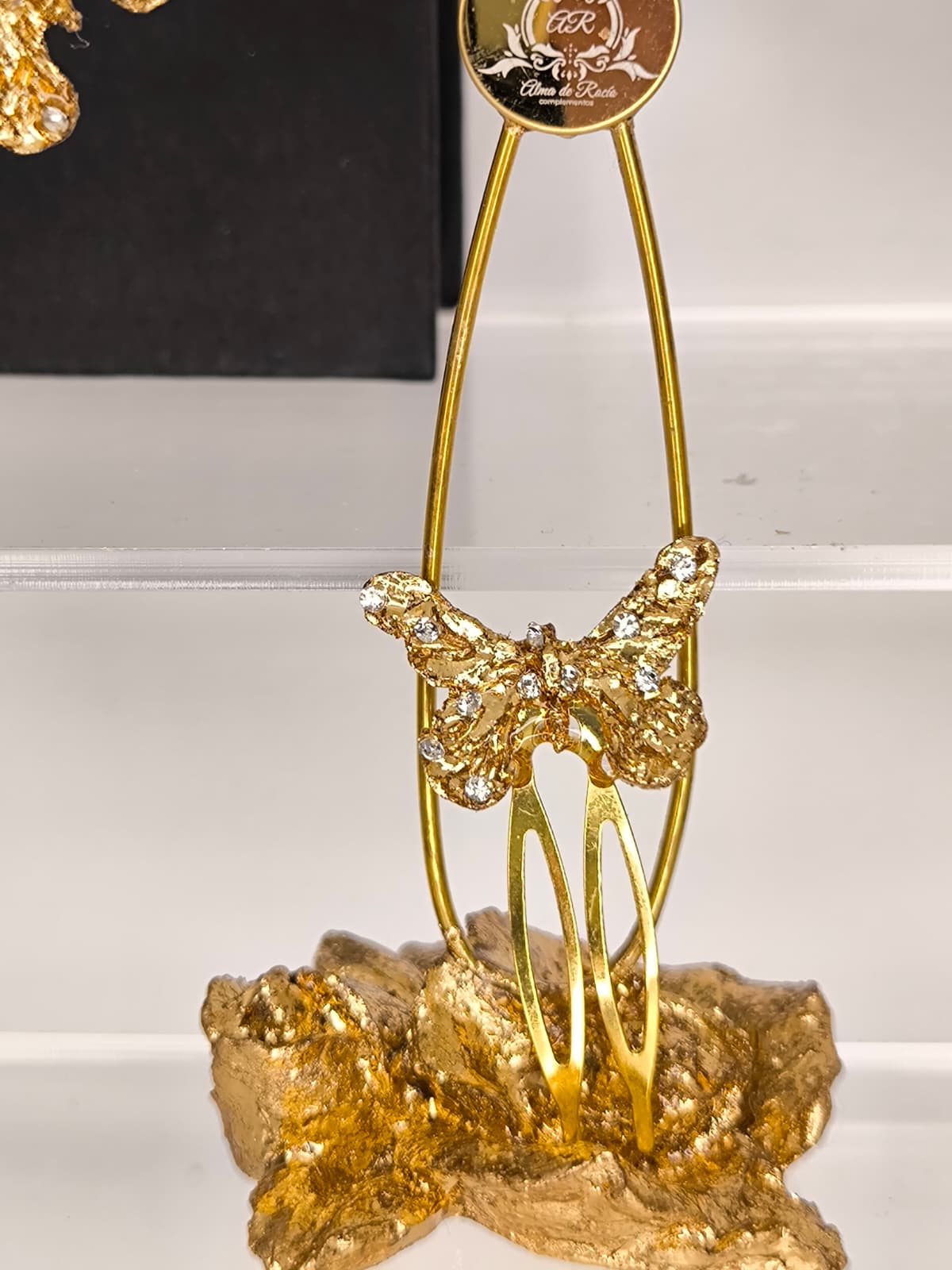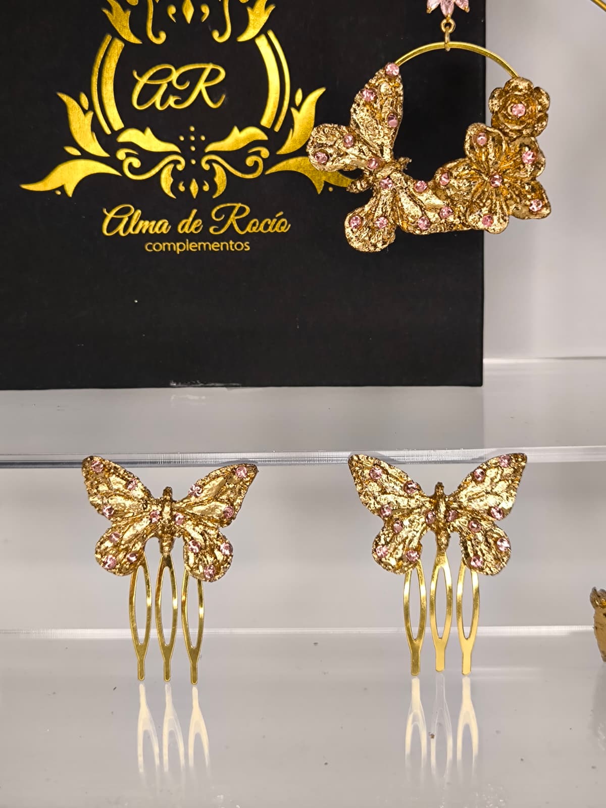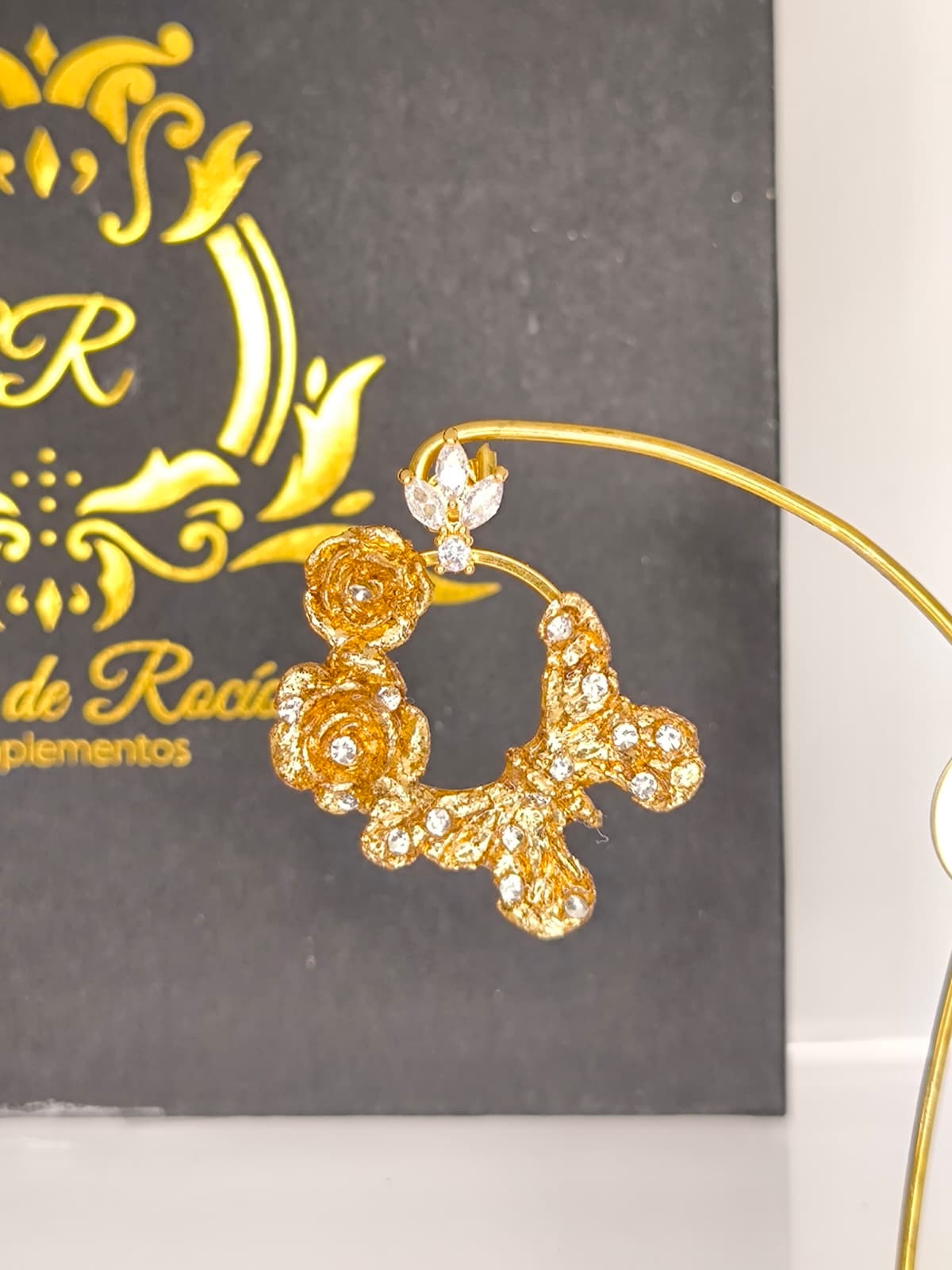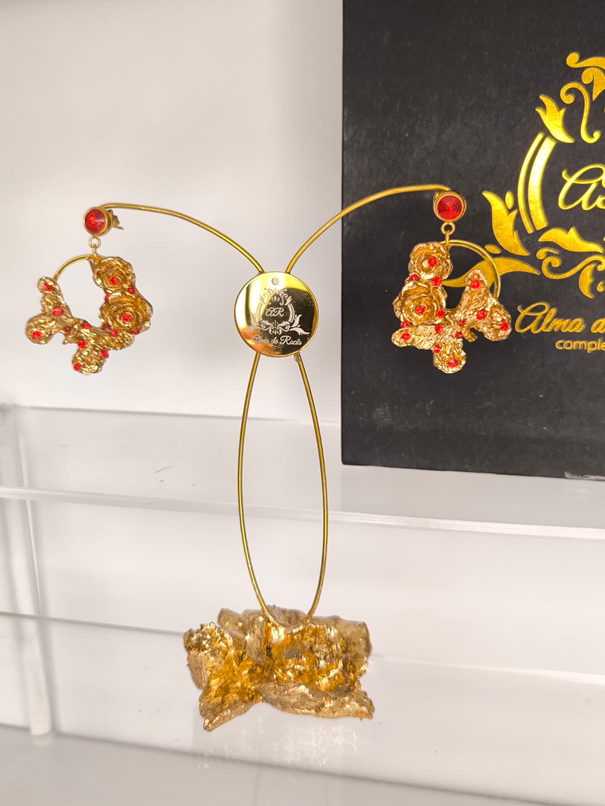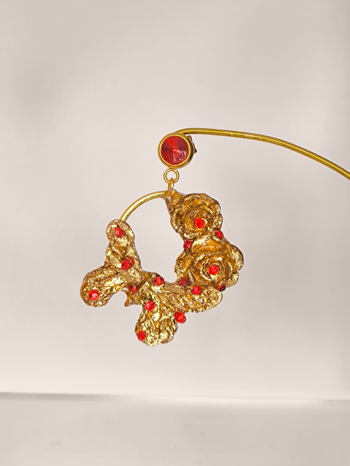 Pendientes artesanales de aro para niña realizados en material superligero, cubiertos con pan de oro dorado o con color y decorados con cristales en diferentes colores, nácar, perlas....