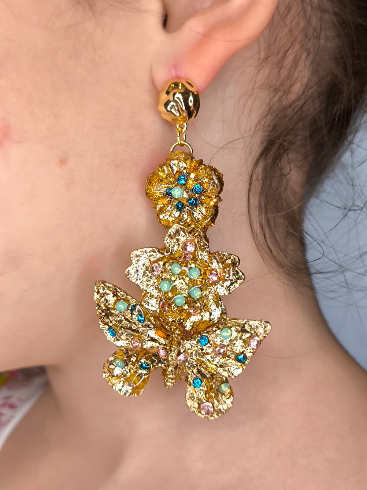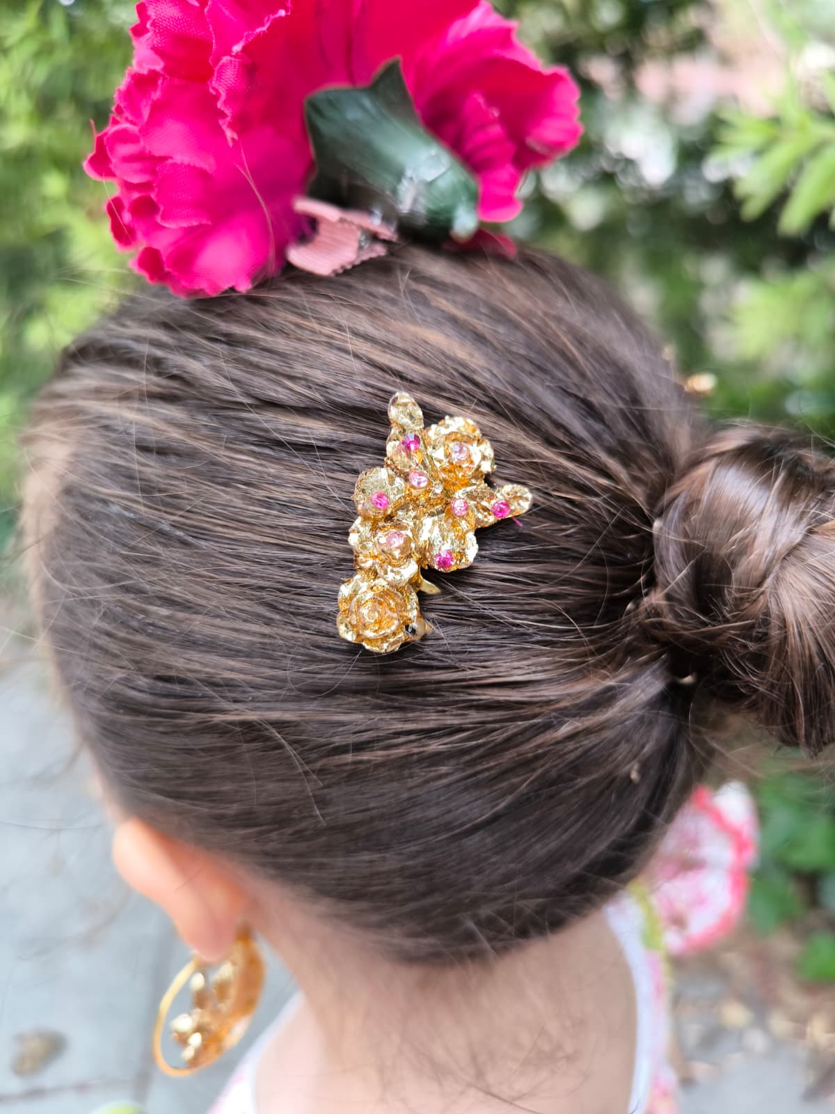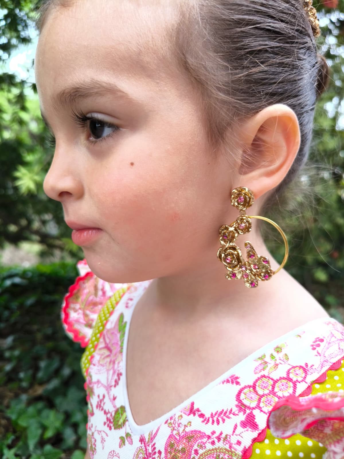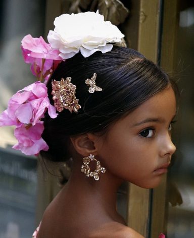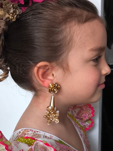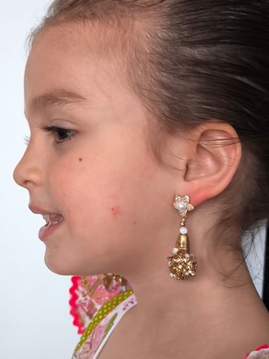 Pendientes y peinecillos artesanales para niña realizados en material superligero, cubiertos con pan de oro dorado o con color y decorados con cristales en diferentes colores.