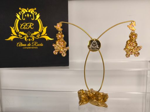 Pendientes artesanales con forma de lágrima para niña. Realizados en material superligero con mariposa y flores y cubiertos con pan de oro dorado o con color y decorados con cristales en diferentes colores, nácar, perlas.... Podemos realizarlos con diferentes cierres y tamaños.