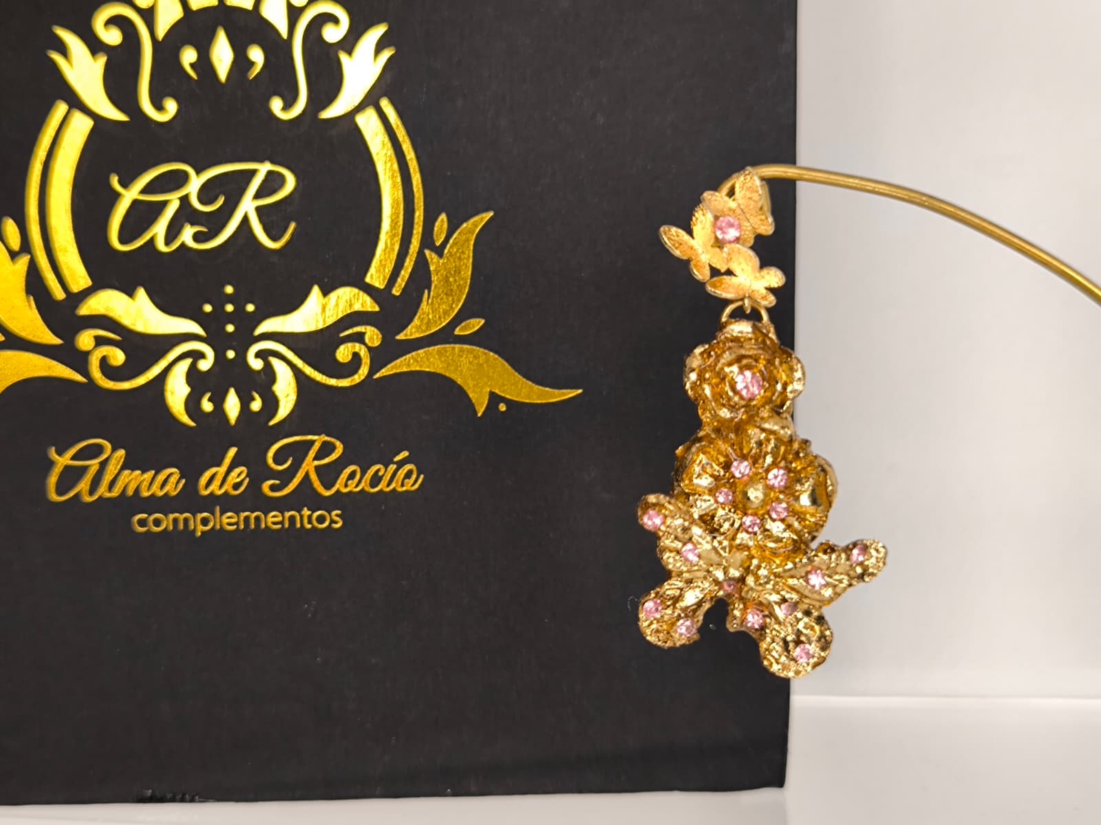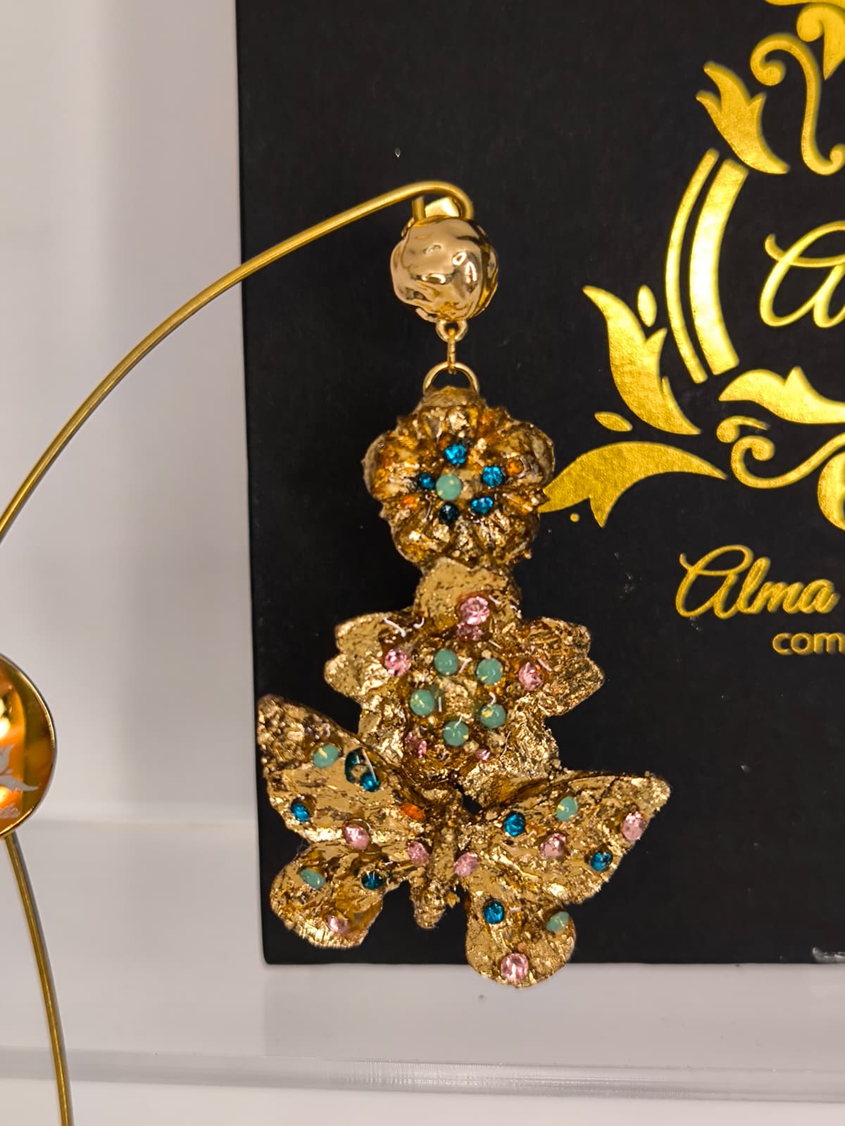 Pendientes artesanales con forma de lágrima para niña. Realizados en material superligero con mariposa y flores y cubiertos con pan de oro dorado o con color y decorados con cristales en diferentes colores, nácar, perlas.... Podemos realizarlos con diferentes cierres y tamaños.