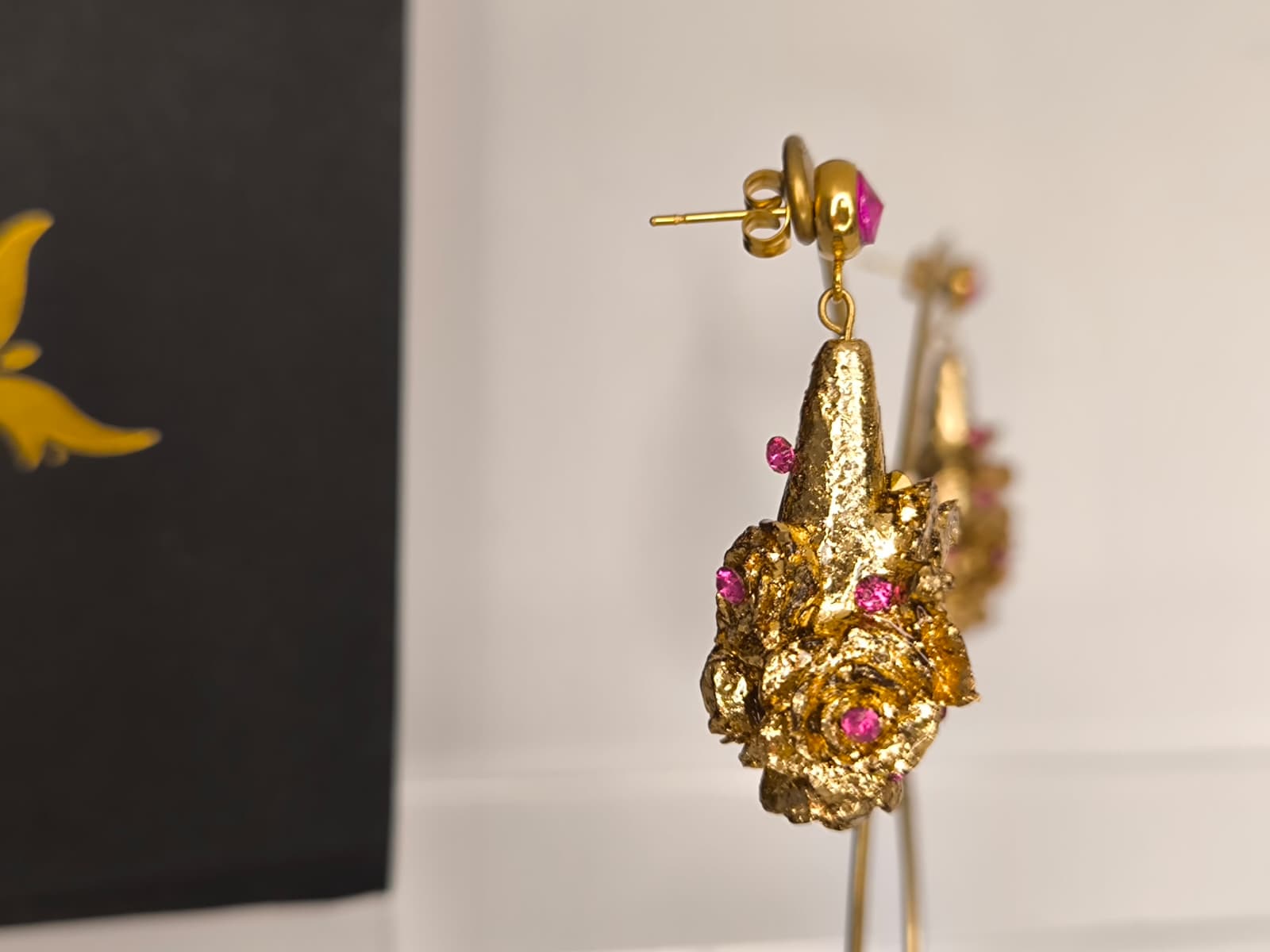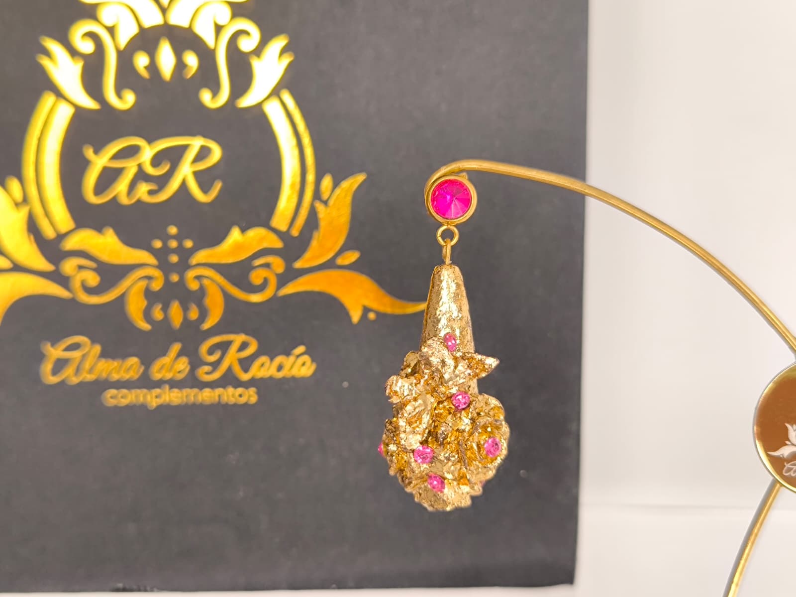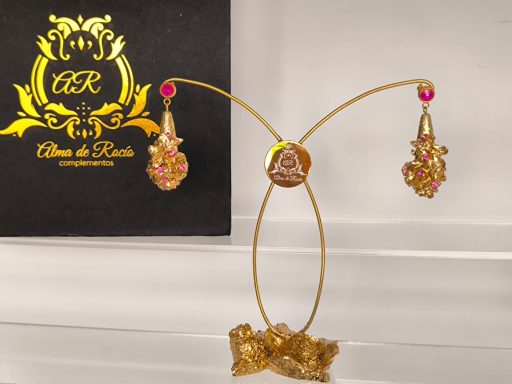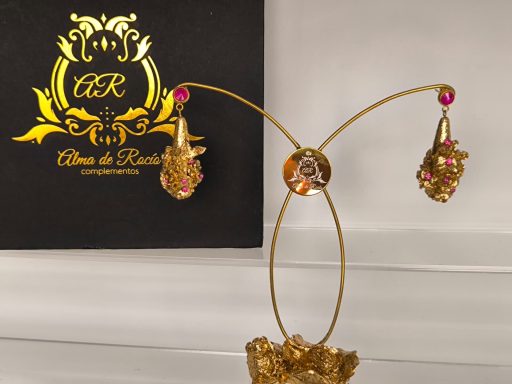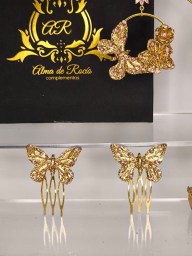 Pendientes artesanales con forma de lágrima para niña realizados en material superligero, realizados con rosas y mariposa y recubiertos en pan de oro dorado o con color y decorados con cristales en diferentes colores, nácar, perlas.... Podemos realizarlos con diferentes cierres y tamaños.
