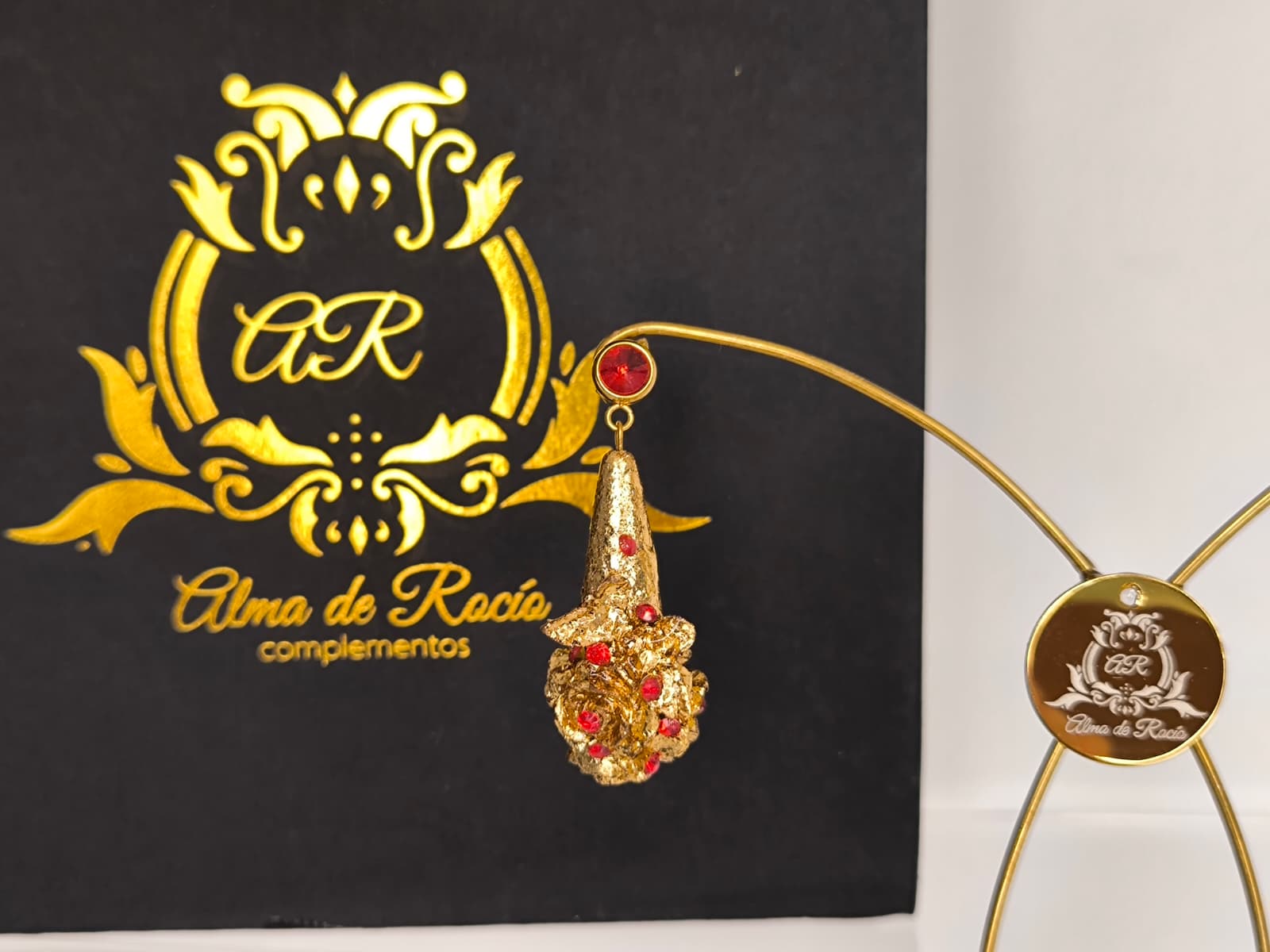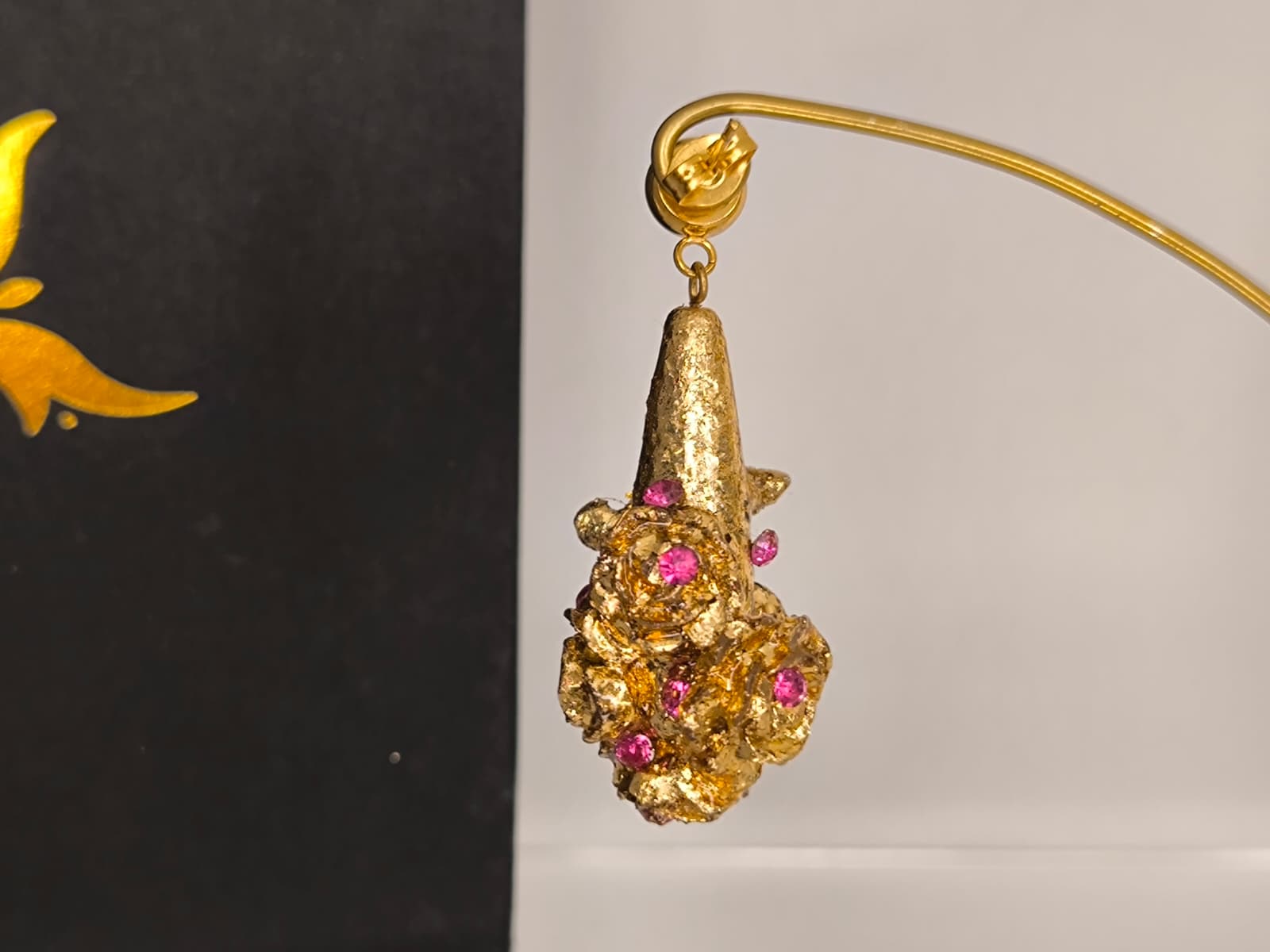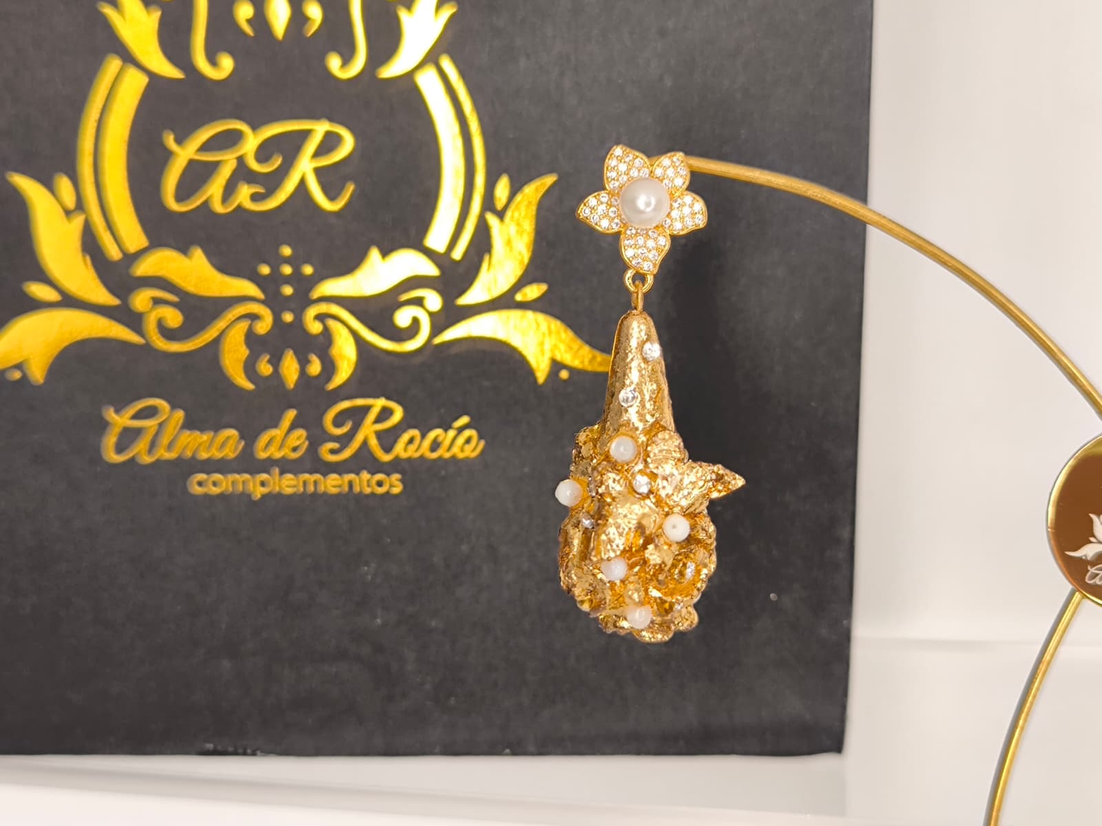 Pendientes artesanales con forma de lágrima para niña realizados en material superligero, realizados con rosas y mariposa y recubiertos en pan de oro dorado o con color y decorados con cristales en diferentes colores, nácar, perlas.... Podemos realizarlos con diferentes cierres y tamaños.